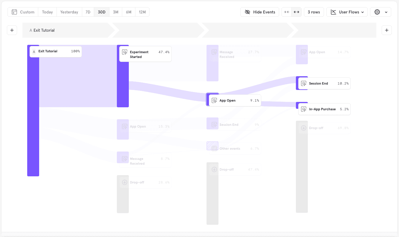 User Flows displays a Sankey diagram where the height of the bar is proportional to the number of users who perform that specific event, and the height of the lines that connect bars are proportional to the number of users who perform the the two events in sequence.